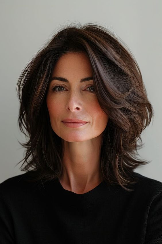 A sophisticated, medium-length layered cut with voluminous waves for a fuller look. The deep brown color enhances the style’s depth, offering a versatile and timeless option that adds body and bounce to the hair without much effort.