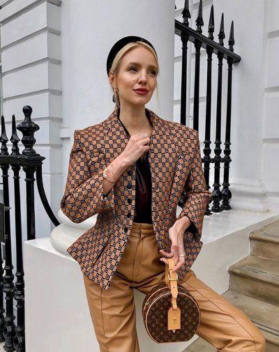 A bold, geometric blazer and sleek velvet headband create a chic, modern look. Styled with camel-colored leather pants and a statement round handbag, this outfit is sophisticated and ideal for city outings or brunch with friends.