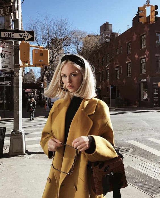 A mustard yellow coat and black headband make a striking combination in this urban chic outfit. Paired with a black sweater and structured bag, this look is effortlessly stylish, adding a pop of color to a classic, minimalist aesthetic.