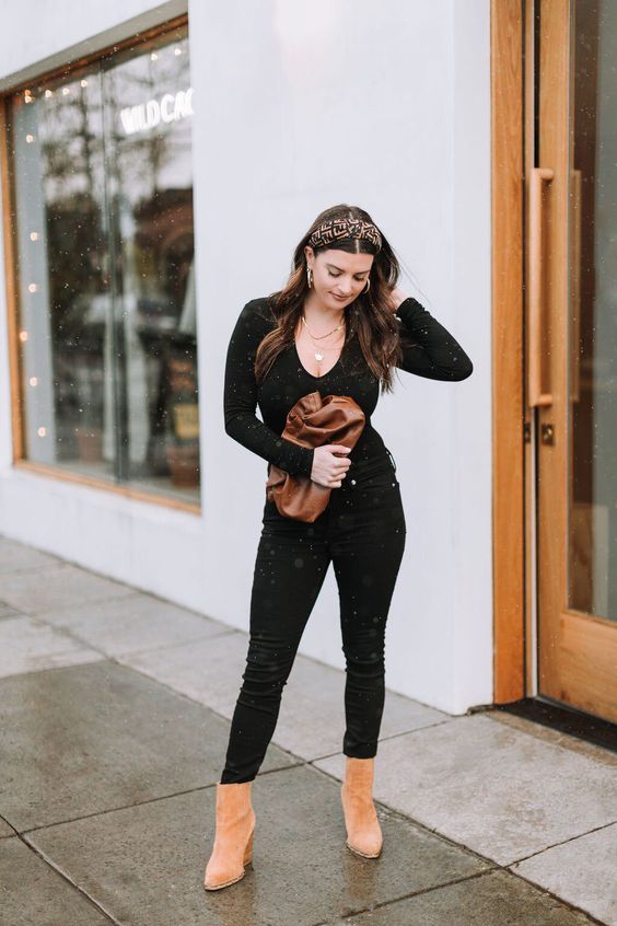 This all-black ensemble, featuring a fitted top and skinny jeans, is elevated by a patterned headband and brown accessories. With ankle boots and a leather clutch, it’s a perfect outfit for a sleek, stylish, and versatile look.