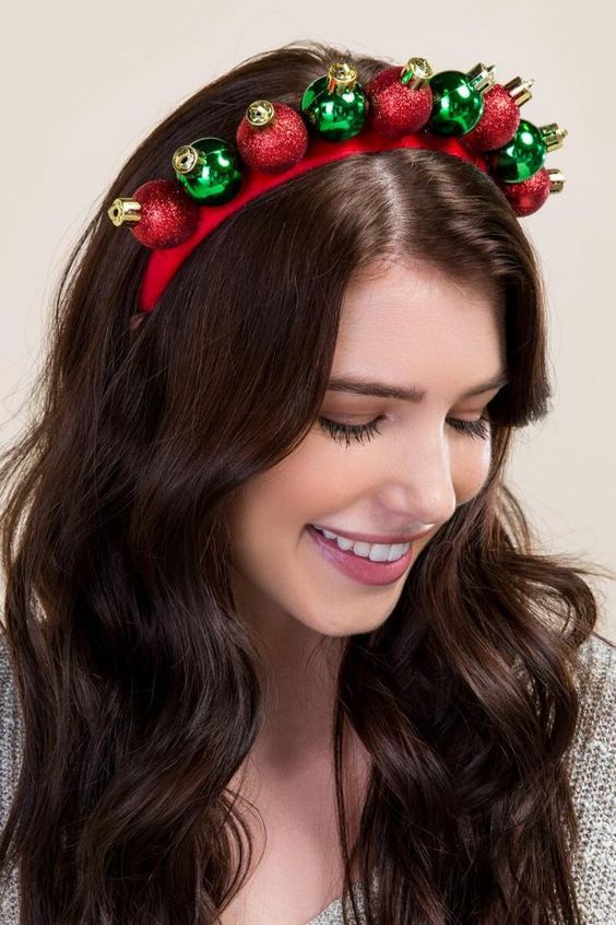 For Christmas, a festive headband with a red and green outfit brings holiday cheer to any gathering.
