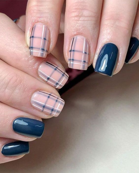 This design combines classic blue polish with a nude base, creating a sophisticated plaid pattern. The bold blue lines intersect delicately on a clear nude background, making the design pop. The contrast between the deep blue and the soft nude makes this design versatile enough to match any fall outfit. Cute and elegant, these plaid nails are perfect for any occasion.