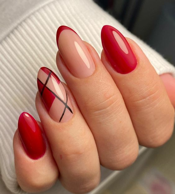 A combination of red and nude creates an elegant and classic plaid design. The red tips and almond shape of the nails add a touch of sophistication, while the nude base keeps the look balanced. This design is perfect for formal events or a stylish day out.