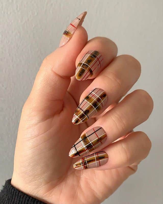 These nails feature a warm brown base accented with black plaid lines. The combination of brown and black creates a rich and luxurious look, perfect for fall. The sharp, almond shape of the nails enhances the elegance of the design. This look is great for adding a touch of warmth and sophistication to your autumn style.