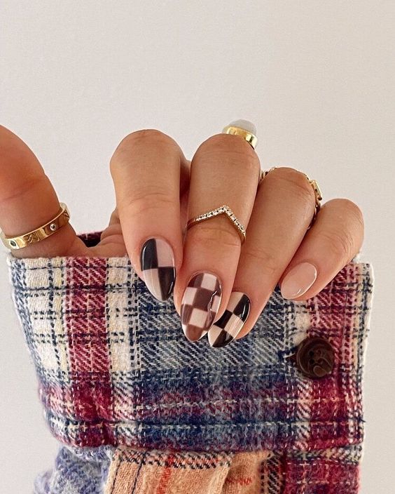 This design features a mix of neutral tones like beige, brown, and cream, creating a subtle yet stylish plaid pattern. The short and almond shape of the nails makes this design perfect for everyday wear. The soft, muted colors are ideal for a sophisticated and understated look.
