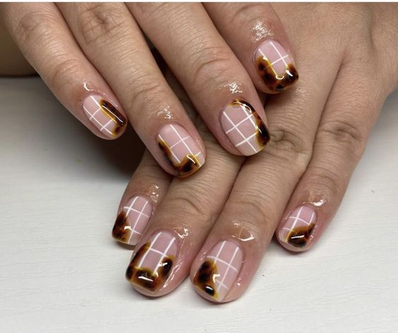 Combining tortoiseshell tips with a subtle plaid pattern, these nails offer a unique and sophisticated look. The clear base highlights the intricate plaid design, while the tortoiseshell tips add a trendy twist. This design is ideal for those who love to experiment with different textures and patterns.