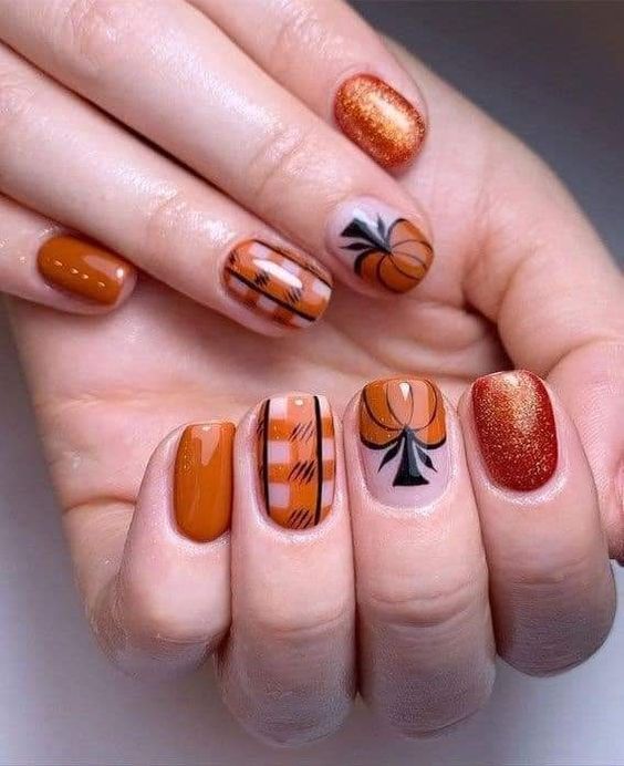 Embrace the festive spirit of fall with these orange plaid nails. The vibrant orange base is complemented by plaid patterns and cute pumpkin designs, making it perfect for Halloween and Thanksgiving. The mix of orange and plaid captures the essence of fall festivities, making these nails a fun and playful choice.