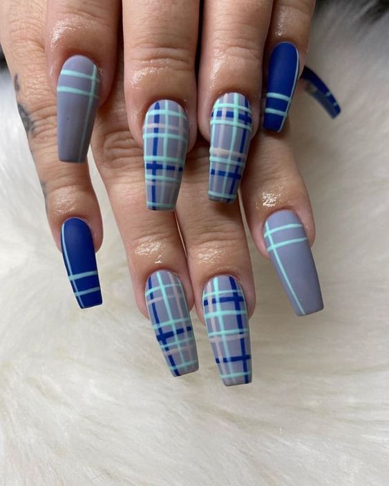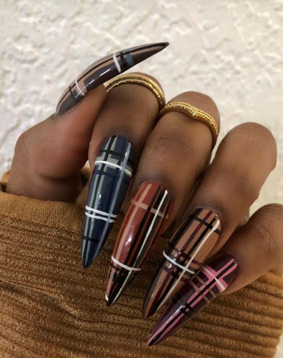 This design features long, pointed nails with a multi-colored plaid pattern. The combination of various colors like blue, brown, and pink creates a vibrant and eye-catching look. The long, sharp tips add a dramatic flair, making these nails perfect for those who love bold and daring designs.