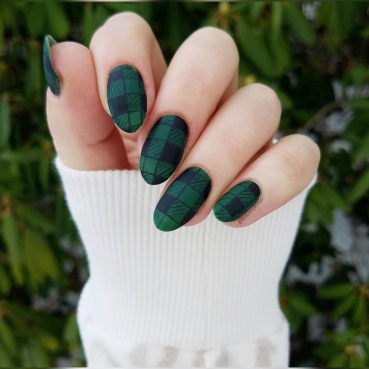 Embrace the beauty of nature with green and black matte plaid nails. The deep green and bold black create a rich and earthy tone, ideal for the fall season. The matte finish adds a modern twist, making the nails stand out with their subtle yet striking appeal. This design is perfect for those who love art and nature-inspired themes.