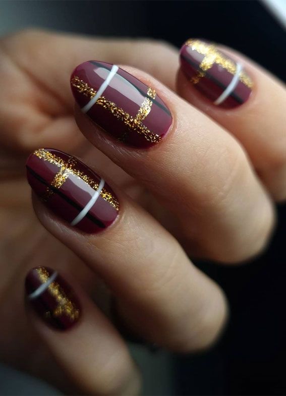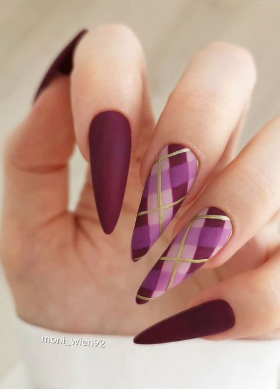 For a regal touch, opt for purple plaid nails with gold accents. The rich, matte purple base is adorned with gold lines, adding a touch of luxury and sophistication. This design is perfect for formal events or a night out, blending cute aesthetics with a maroon undertone for a striking effect.