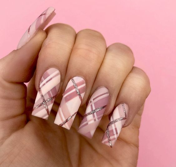 Pink and glitter make for a cute and festive fall design. The almond shape of the nails complements the soft pink plaid pattern, while glitter lines add a touch of sparkle. This design is perfect for those who want to bring a bit of warmth and playfulness to their fall nail art.