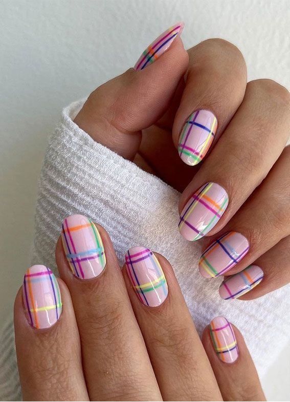 For those who love bold and vibrant designs, these multicolored plaid nails are a perfect choice. The green, orange, and blue lines create a lively and playful pattern, ideal for making a statement. This design is fun, cute, and perfect for those who love to experiment with colors.