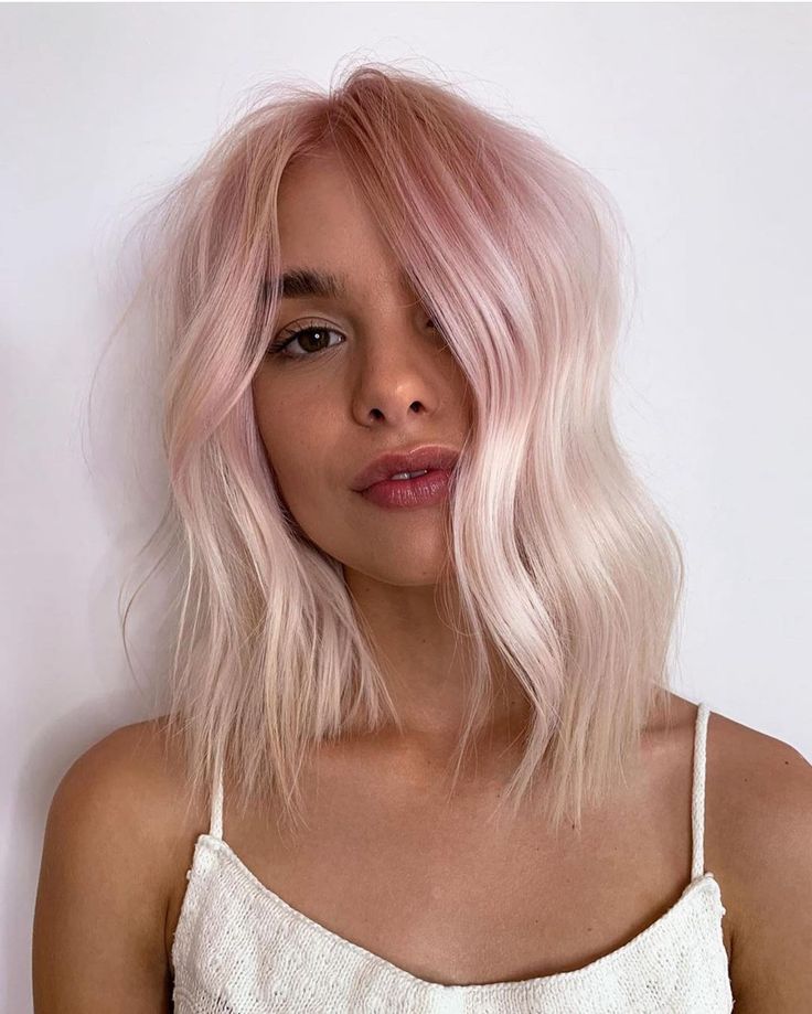 This look combines soft, romantic light blonde waves with a subtle pink tint, creating an ethereal vibe. The pink undertone adds warmth and playfulness, making it perfect for springtime. Styled with a tousled texture, this cut is ideal for those with 2025 medium length hair who want something trendy yet approachable. The addition of dark roots ensures a seamless grow-out process while providing contrast.