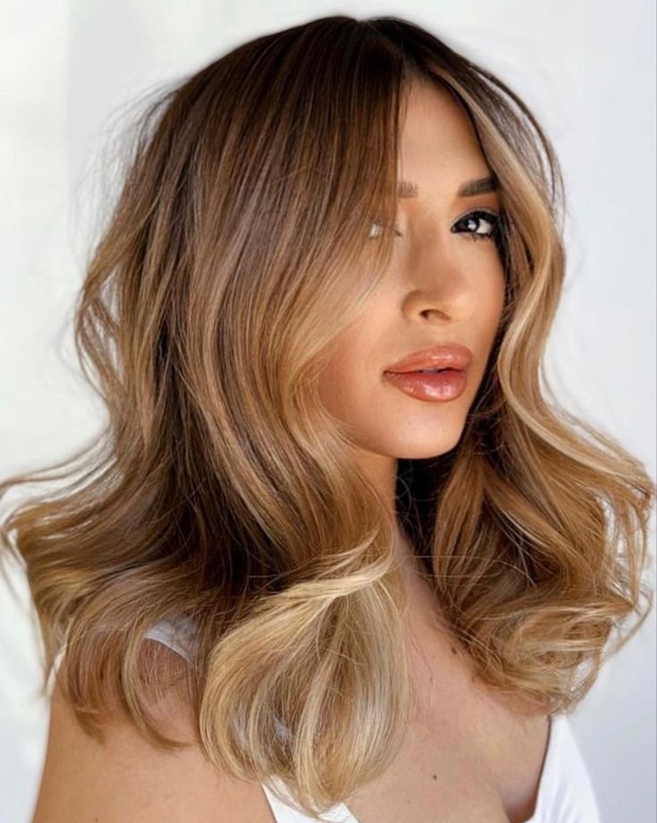 This caramel-toned balayage blends seamlessly with dark roots, offering a low-maintenance yet stunning look. The warm tones bring out a natural glow, ideal for women who want to embrace 2025 medium-length color ideas.