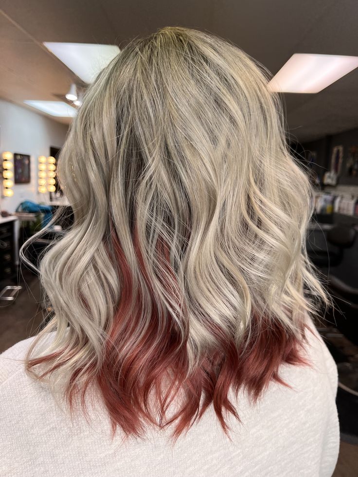 This striking hair design features light blonde hair that fades into vibrant auburn ends, creating a two-tone effect. The smooth transition adds dimension and depth, perfect for those looking to experiment with 2025 balayage trends. This is a bold yet elegant choice for women with medium length hair looking for standout color ideas.