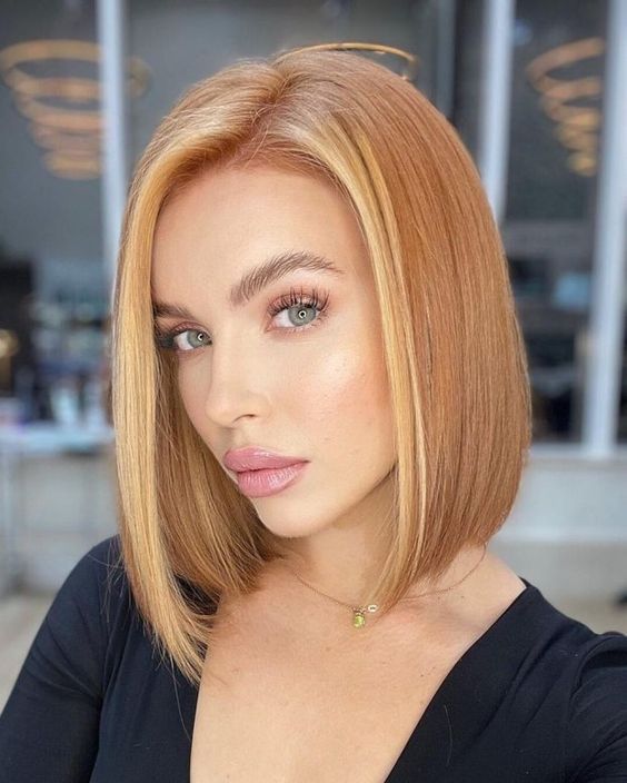 This sleek bob is elevated with rich copper blonde tones, offering a sophisticated twist on classic blonde. The bright yet warm hue is perfect for highlighting the jawline and complements short hair ideas for 2025.
