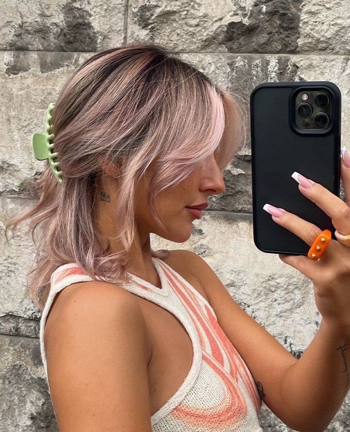 Blush blonde with layered waves offers a playful and youthful vibe, ideal for spring. The addition of cute accessories like clips adds a trendy touch, while the dark roots ensure a low-maintenance grow-out.