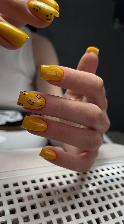 Bring some fun into your spring nail game with bright yellow nails and playful smiley face accents. This cheerful design is perfect for a cute, quirky look. Combine it with light, breezy outfits to highlight its youthful charm.