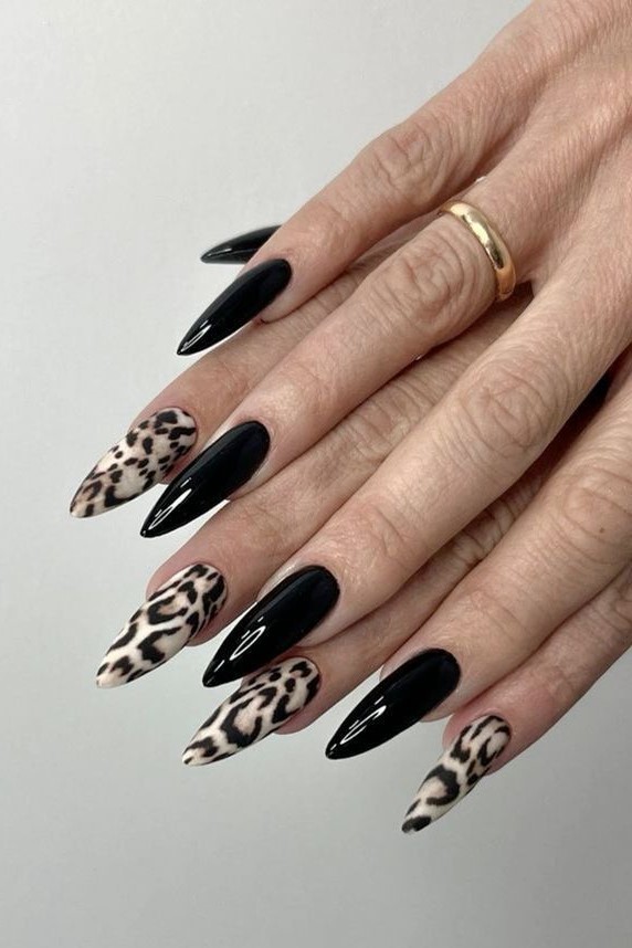 Make a statement with glossy black nails paired with leopard-patterned accents. The long, pointed shape adds drama, while the animal print keeps it trendy. This daring look is perfect for those who love to express themselves boldly.