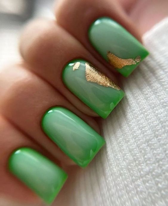 Fresh, minty green nails with a hint of gold foil are ideal for those who want something unique yet sophisticated. This bold yet refreshing choice represents spring foliage and new beginnings. The glossy finish and minimal accent details make these nails trendy and cute for any occasion.