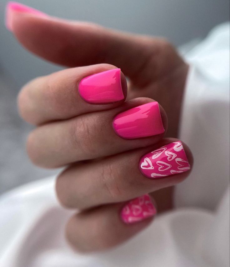 Brighten up your spring with bubblegum pink nails that are fun and playful. Featuring one accent nail with hand-painted heart details, this short design is ideal for women who love to keep it trendy yet low-maintenance. Pair it with bold accessories for a standout look.