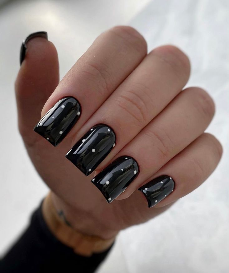 For a more sophisticated spring vibe, try sleek black nails with white polka dots. The high-gloss finish and minimalist design make this an ideal choice for evening events or professional settings. The square shape gives it a structured, modern feel.