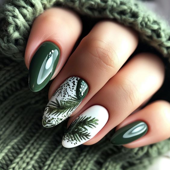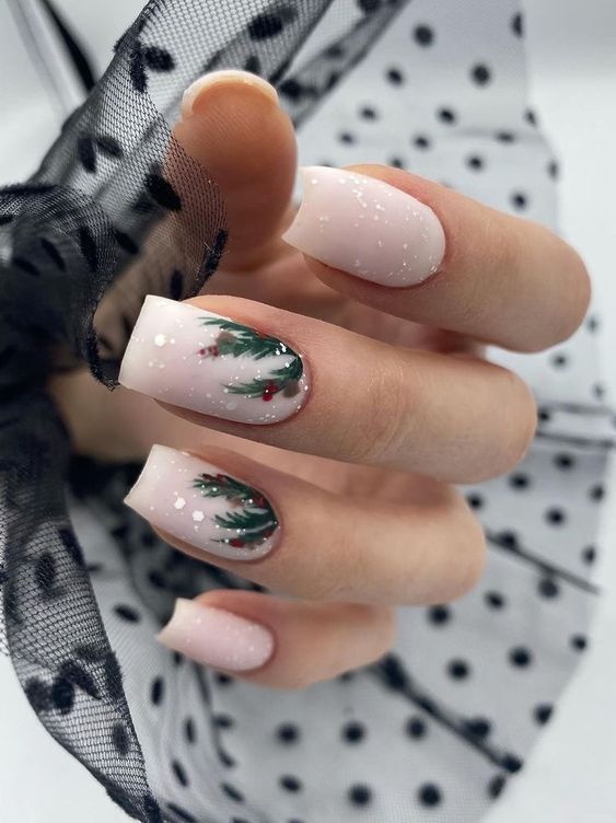 For those who prefer a round or oval nail shape, this delicate pine design in a soft winter white offers a minimalistic and elegant option for the holiday season. The short nail shape with light pine tree accents makes it ideal for both professional settings and formal occasions, such as holiday office parties or even winter weddings. The soft, neutral tones ensure the nails remain versatile and cute, while the delicate detailing adds just enough festive flair.