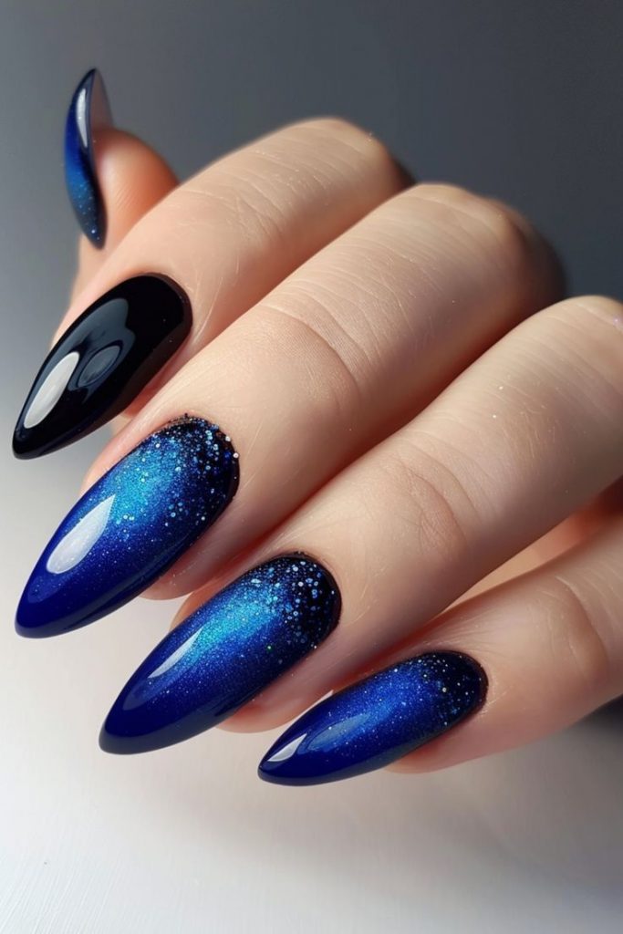 For those looking to make a statement, this stiletto design with a gradient of midnight blue and black is perfect for a glamorous winter look. The starry night effect brings the magic of the winter sky to your nails. This design is perfect for formal occasions like a black-tie event or birthday celebrations, adding an element of sophistication and mystery.