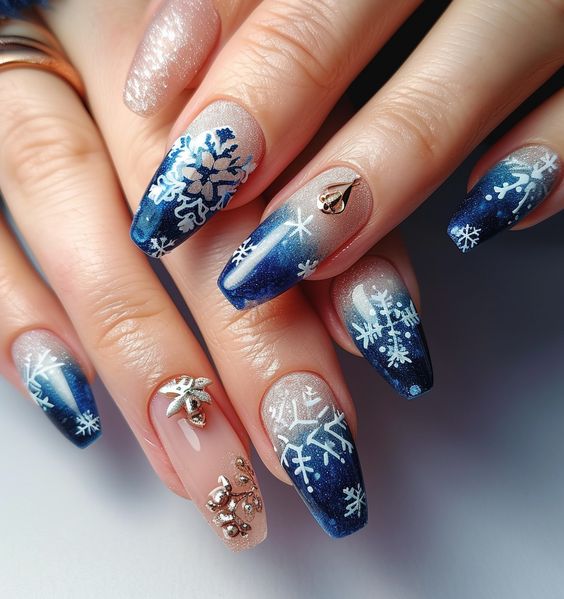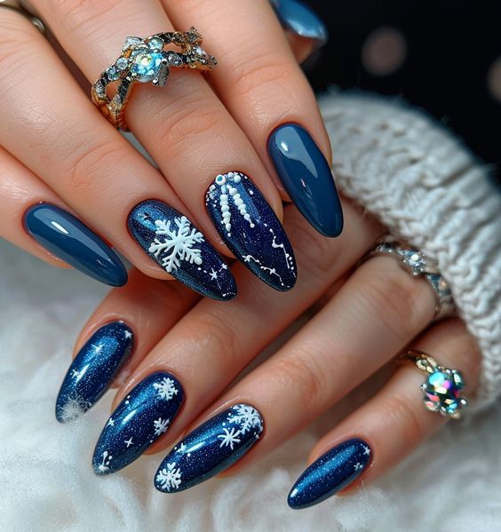 Incorporating deep blue tones with a shimmering stiletto shape, this nail design screams winter night magic. Featuring delicate snowflakes and white accents, this long nail design creates a captivating contrast that’s sure to stand out in any winter occasion, from holiday parties to fun nights out. The icy details bring a funky and festive twist to an otherwise formal set of nails, blending elegance with the right touch of winter charm.