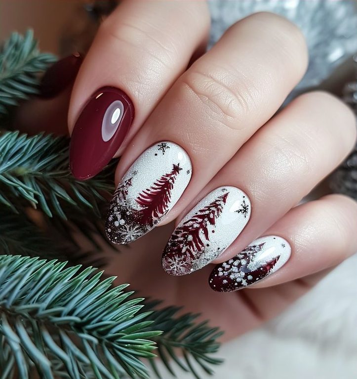 To balance out this festive set, consider wearing a simple white or cream dress paired with warm burgundy or berry-toned accessories. The contrast between the nails and outfit will create a chic and cohesive winter look.