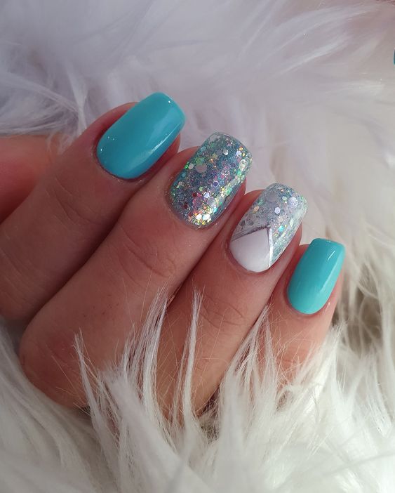 For a cute short winter nail look, this short almond winter design mixes a refreshing aqua color with glitter accents. The short almond shape makes it fun yet practical for everyday wear, offering a modern yet low-maintenance look. The glitter adds a frosty touch, reminiscent of snowflakes glimmering in the light, making it a perfect choice for the holiday season or winter birthday celebrations. The simple almond design is great for those who want a bit of sparkle without the fuss of overly long nails.