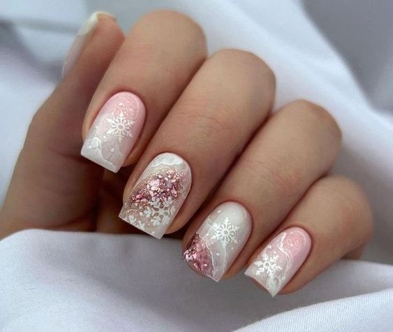 This square nail design is perfect for those who love a mix of femininity and winter wonderland. The soft pink and white base provides a delicate background for intricate snowflake details, with a hint of rose gold glitter that adds an element of glam. This design works beautifully for weddings or formal occasions, while still being cute enough for everyday winter wear.