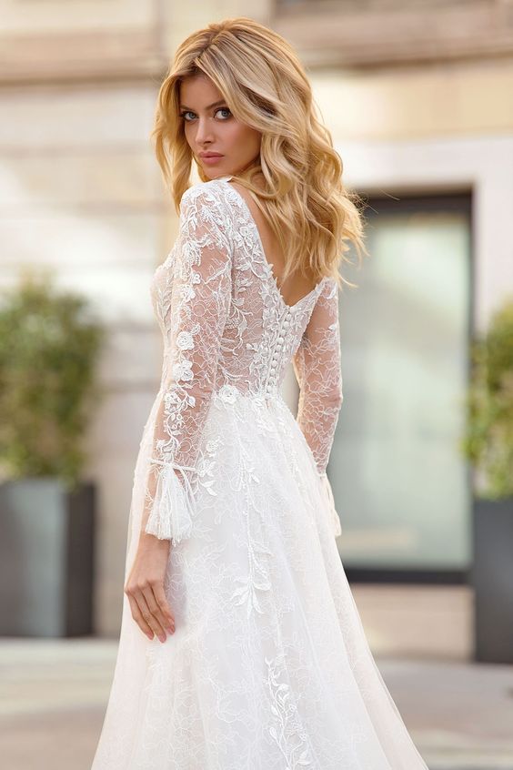 This dress is the epitome of ethereal beauty, with long, lace sleeves that provide a transparent allure. The low back design is both daring and delicate, an enchanting choice for a bride seeking a hint of mystique.