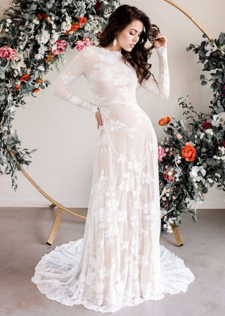 Encapsulating the essence of traditional romance, this dress features an intricate lace wedding dress with long sleeves that taper gracefully at the wrists. The lace’s delicate florals cascade over a subtly contoured silhouette, offering a nod to vintage charm while seamlessly aligning with modern fit standards.