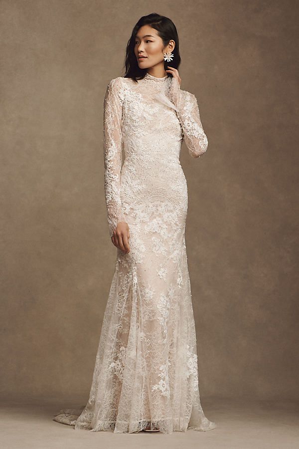 For the minimalist bride, this column sheath gown offers clean lines and a modern approach to lace. The long lace sleeves and high neckline provide a sleek, streamlined look that’s both current and timeless.