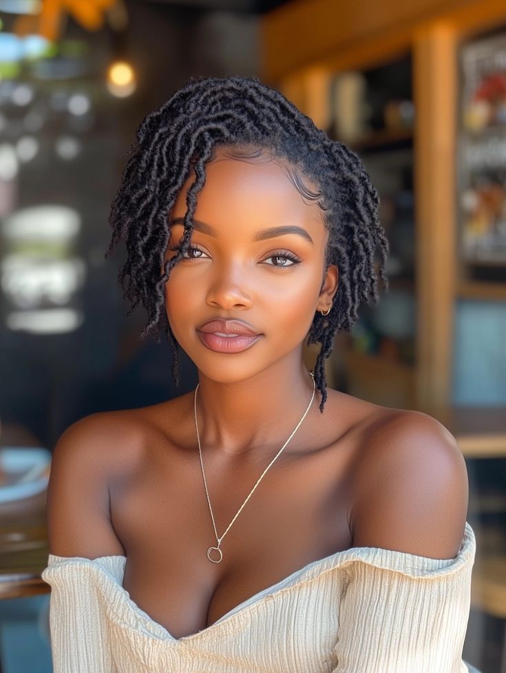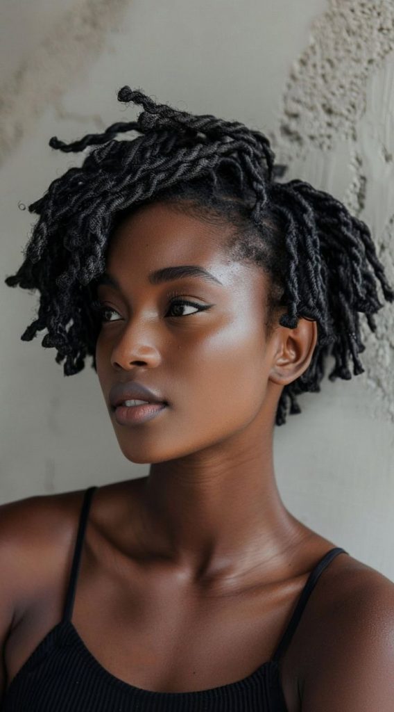Soft twists add depth and texture to this short locs hairstyle, creating an effortlessly curly and stylish vibe. The twists frame the face delicately, making them a great choice for women attending events, dinners, or casual gatherings.
