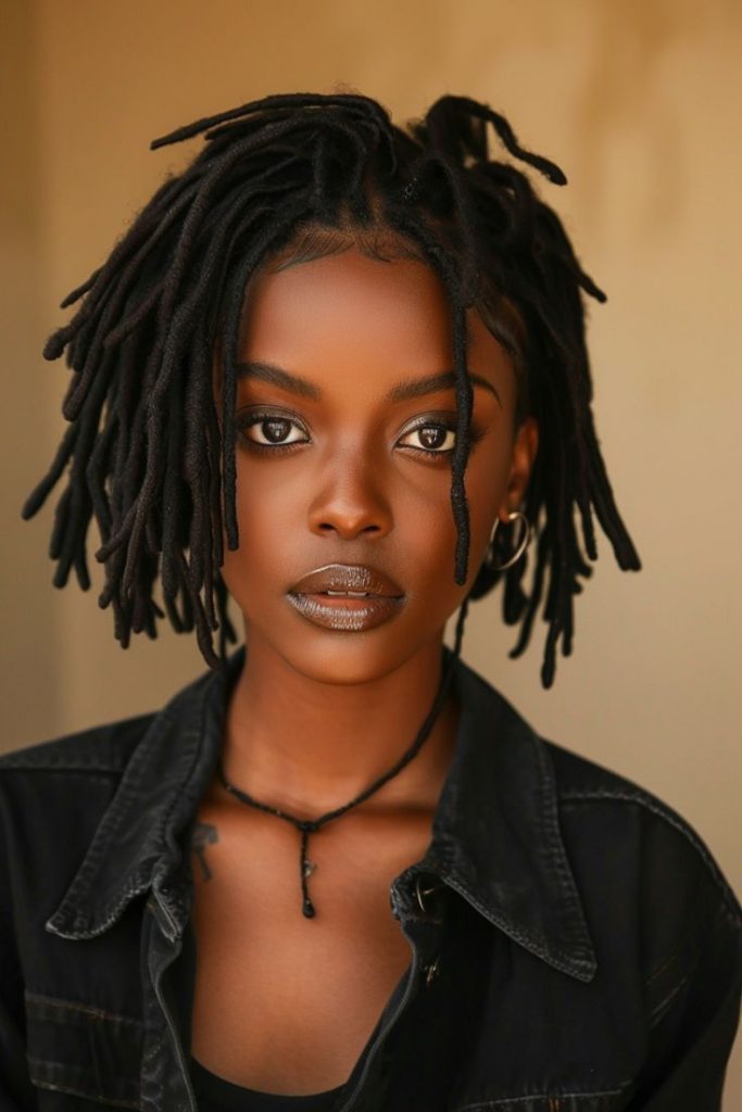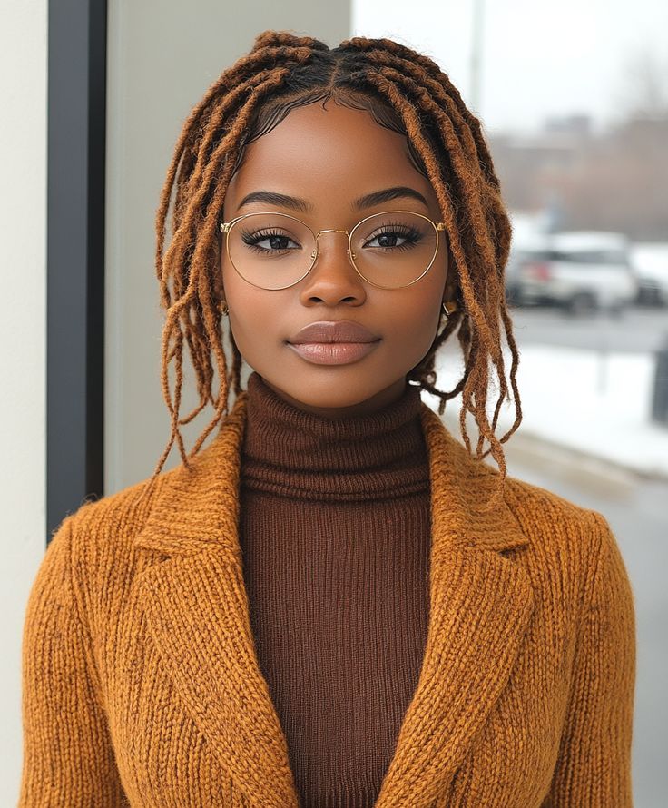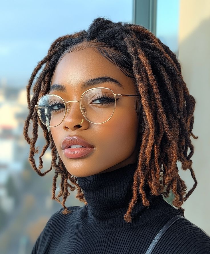 This look blends traditional short locs with a contemporary twist, emphasizing accessories like chic glasses. The hairstyle is understated yet bold, appealing to women who love versatile fashion. It’s suitable for work or a relaxed weekend brunch with friends.