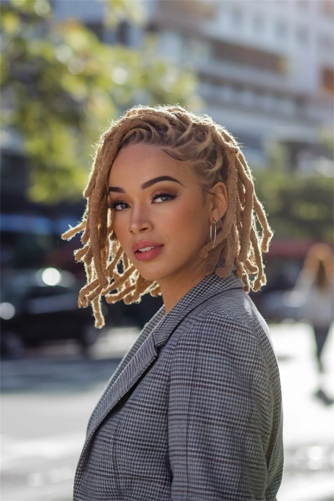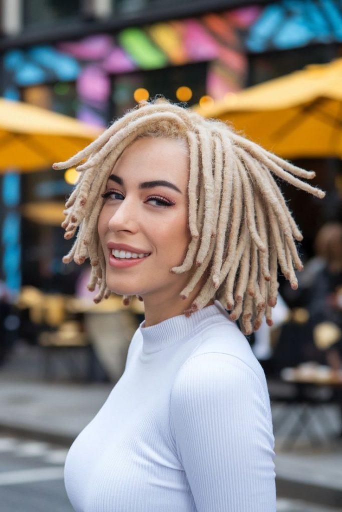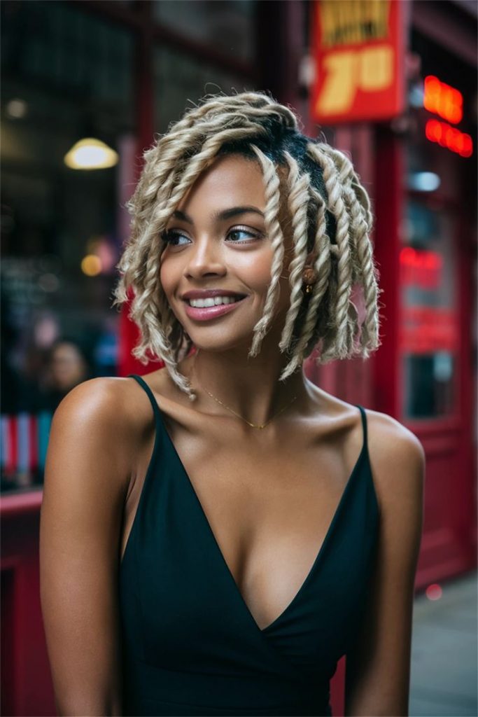 Blonde bob locs provide a playful and youthful twist on classic short locs. The uniform length and bright hue make this style ideal for casual outings or daytime events.