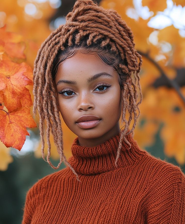 Use lightweight creams to maintain hydration, and add gold or copper-toned beads for an extra touch of elegance. This look is perfect for women seeking a curly, seasonal twist to their locs.