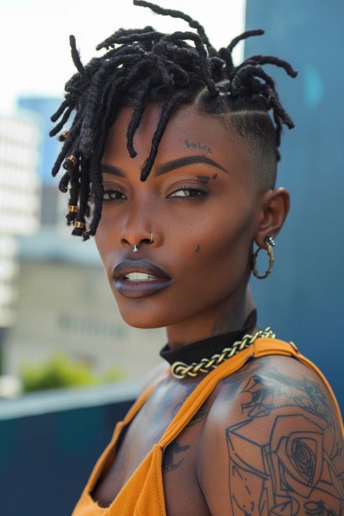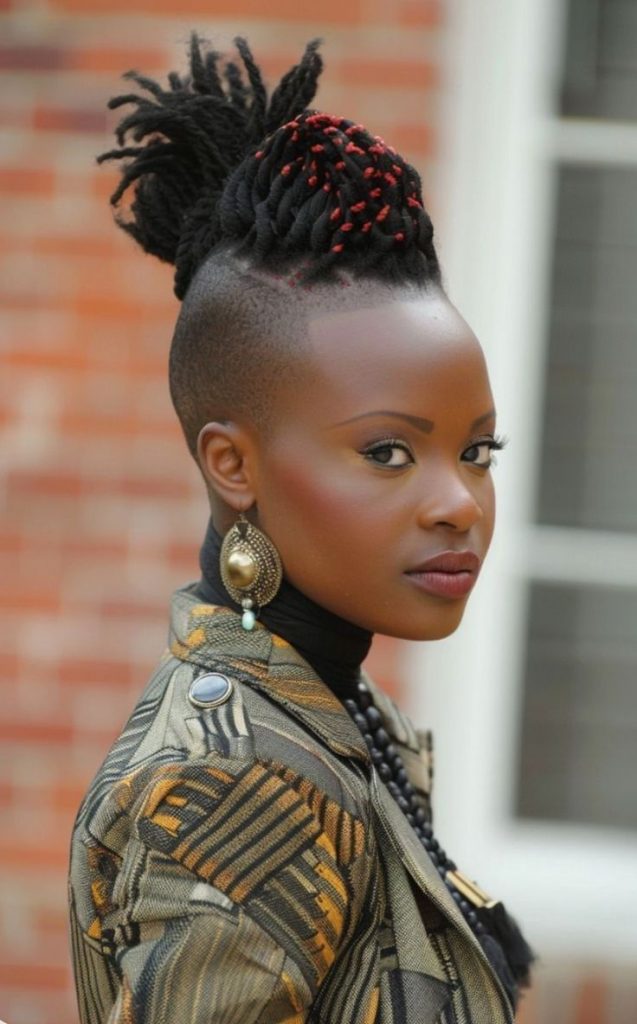 This edgy updo features shaved sides paired with top-styled locs, creating a bold yet feminine silhouette. Perfect for work, school, or artistic gatherings, this hairstyle makes a statement while remaining practical.