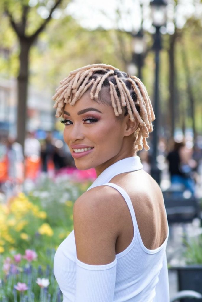 Blonde short locs exude confidence and freshness, ideal for women who enjoy making a statement. This light hue brightens the face and complements a wide range of skin tones, while the side-swept styling creates a youthful allure. Great for school or a casual day, it’s an option that balances boldness and refinement.