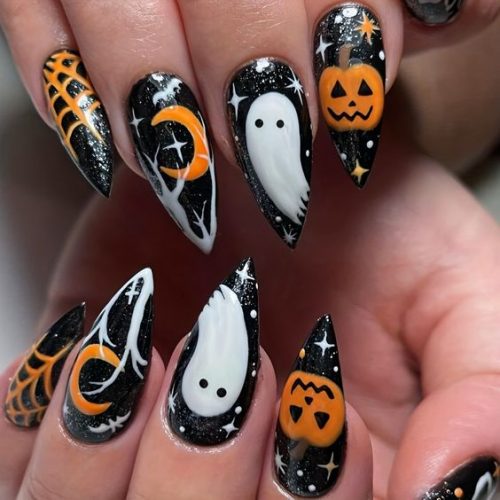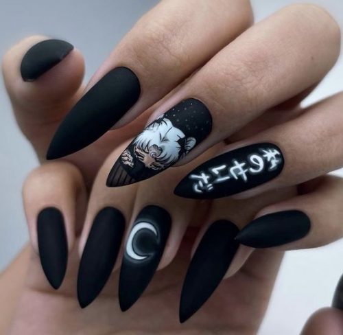 These black nails with wolf and moon designs offer a mysterious and enchanting look. The matte finish on the stiletto nails highlights the intricate details of the wolf and moon, creating a design that’s both mystical and artistic. This is a great choice for those who love a bit of fantasy in their Halloween nail art.