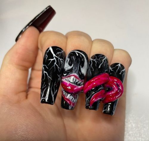Take your Halloween manicure to the next level with these Venom-inspired nails. The dramatic black nails feature intricate white lightning patterns and a vivid, three-dimensional depiction of Venom’s iconic mouth and tongue. This design is perfect for those who love to make a bold statement and incorporate unique art into their look. The long coffin-shaped nails provide a perfect canvas for this detailed and stunning nail art.