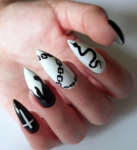 These black and white nails offer a striking contrast perfect for Halloween. The stiletto nails feature a mix of black and white designs, including chains, snakes, and flames. This combination creates a visually appealing and edgy look that is both sophisticated and spooky. The minimalist yet impactful design makes it an excellent choice for those who prefer simple yet bold ideas for their Halloween nails.