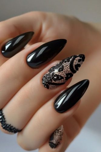 For a touch of elegance this Halloween, try these black nails with lace accents. The almond-shaped nails feature intricate lace patterns that add a sophisticated and mysterious vibe. This simple yet stunning design is ideal for those who want to add a touch of class to their Halloween look. The lace details create a beautiful contrast against the glossy black background, making this design both elegant and festive.