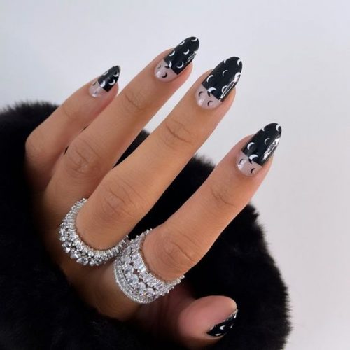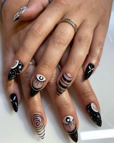 Dive into the mystical with these black nails adorned with moon and star designs. The intricate white and black details on each almond-shaped nail create a celestial theme that’s perfect for Halloween. This acrylic nail design is both whimsical and haunting, making it a fantastic choice for those who love a bit of magic in their nail art.