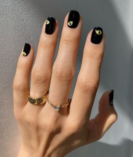 For a subtle yet effective Halloween manicure, try these minimalist black nails with tiny cat eye designs. The short, square nails are chic and easy to maintain, making them perfect for those who prefer simple yet stylish nail art. The small cat eyes add just the right amount of spooky charm without being over-the-top.