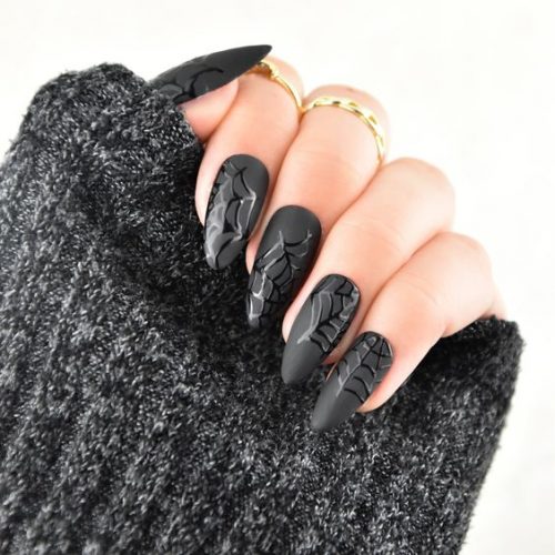 Embrace the spooky season with these textured black nails featuring spider web designs. The 3D effect of the spider webs adds depth and dimension to the coffin-shaped nails, making them a standout choice for Halloween. This design is great for those who want to showcase their love for all things creepy and crawly.