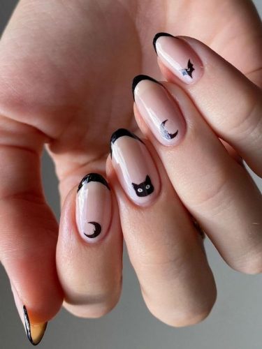 For a more understated look, these black French nails with tiny Halloween icons are perfect. The short, rounded nails feature small, delicate designs like bats, cats, and moons, adding a festive touch without being too bold. This simple design is perfect for those who prefer a more subtle approach to Halloween nail art.