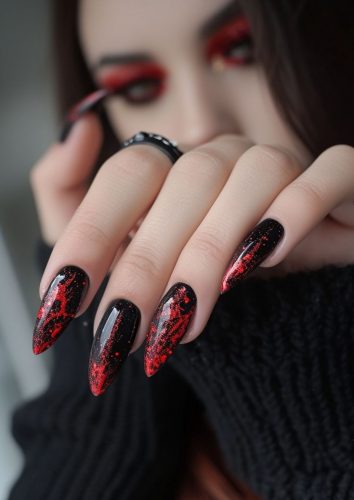 For a truly spooky look, try these black nails with red blood splatter designs. The long stiletto nails feature realistic blood splatter effects, creating a chilling yet stylish manicure. This design is perfect for those who want to embrace the horror aspect of Halloween.